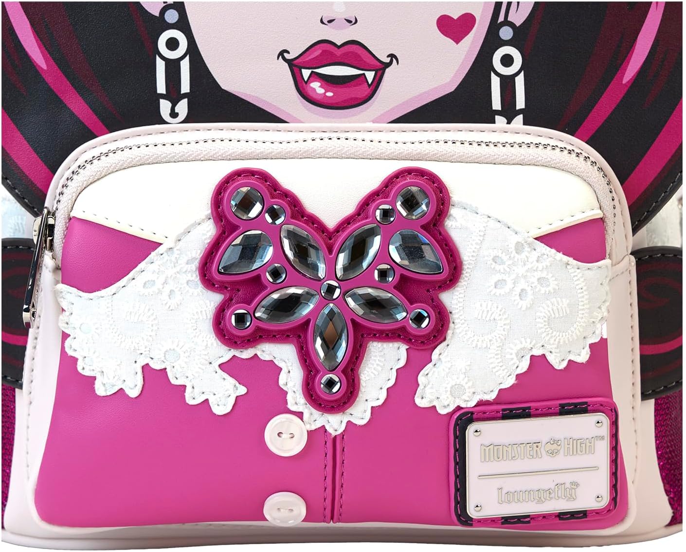 Featuring incredible detail to bring Draculaura to life, this Loungefly mini-backpack is made of vegan leather (polyurethane), has a front zipper compartment, side pockets, and adjustable back straps.