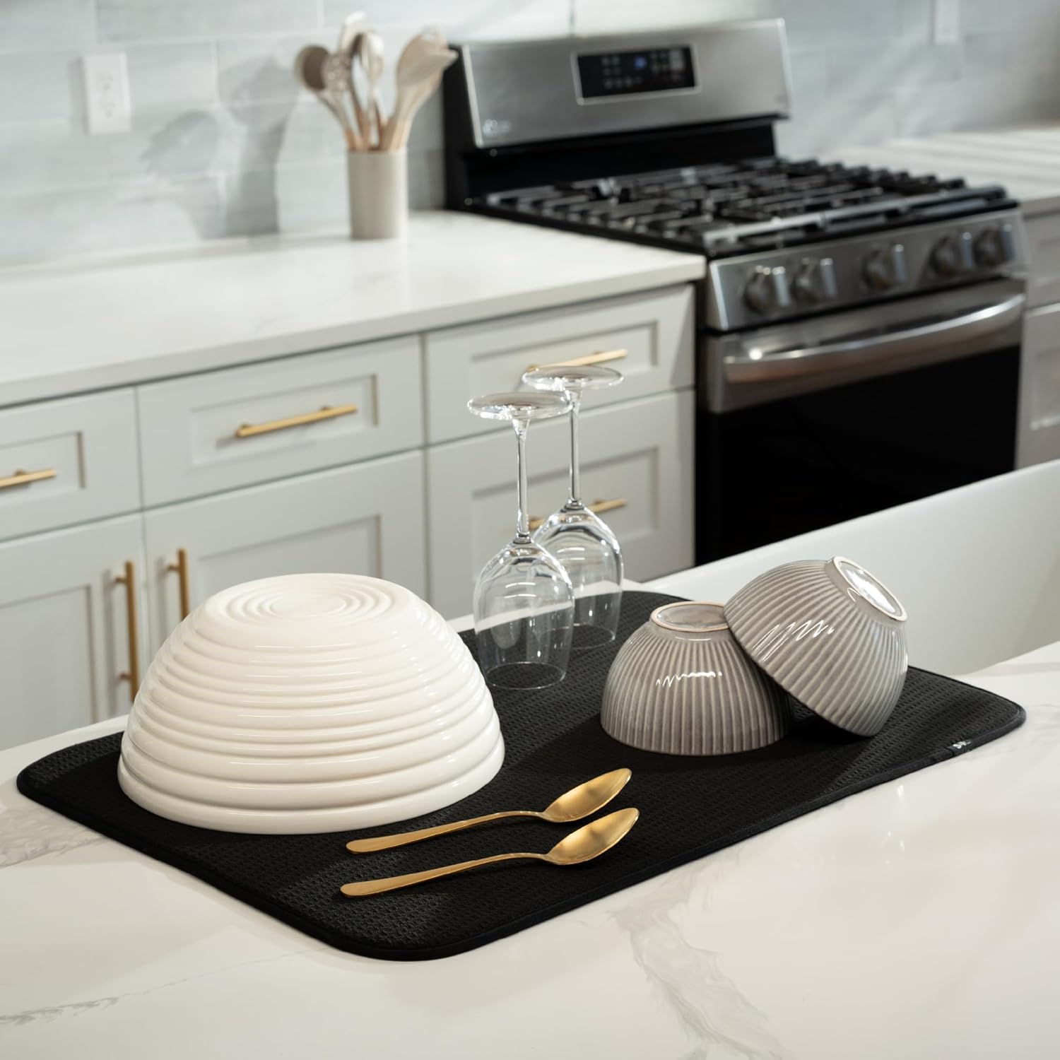 Catch the kitchen sink drips under a dish drying rack or place your plates, forks, spoons, pots and pans set, or glassware directly on the drying mat kitchen