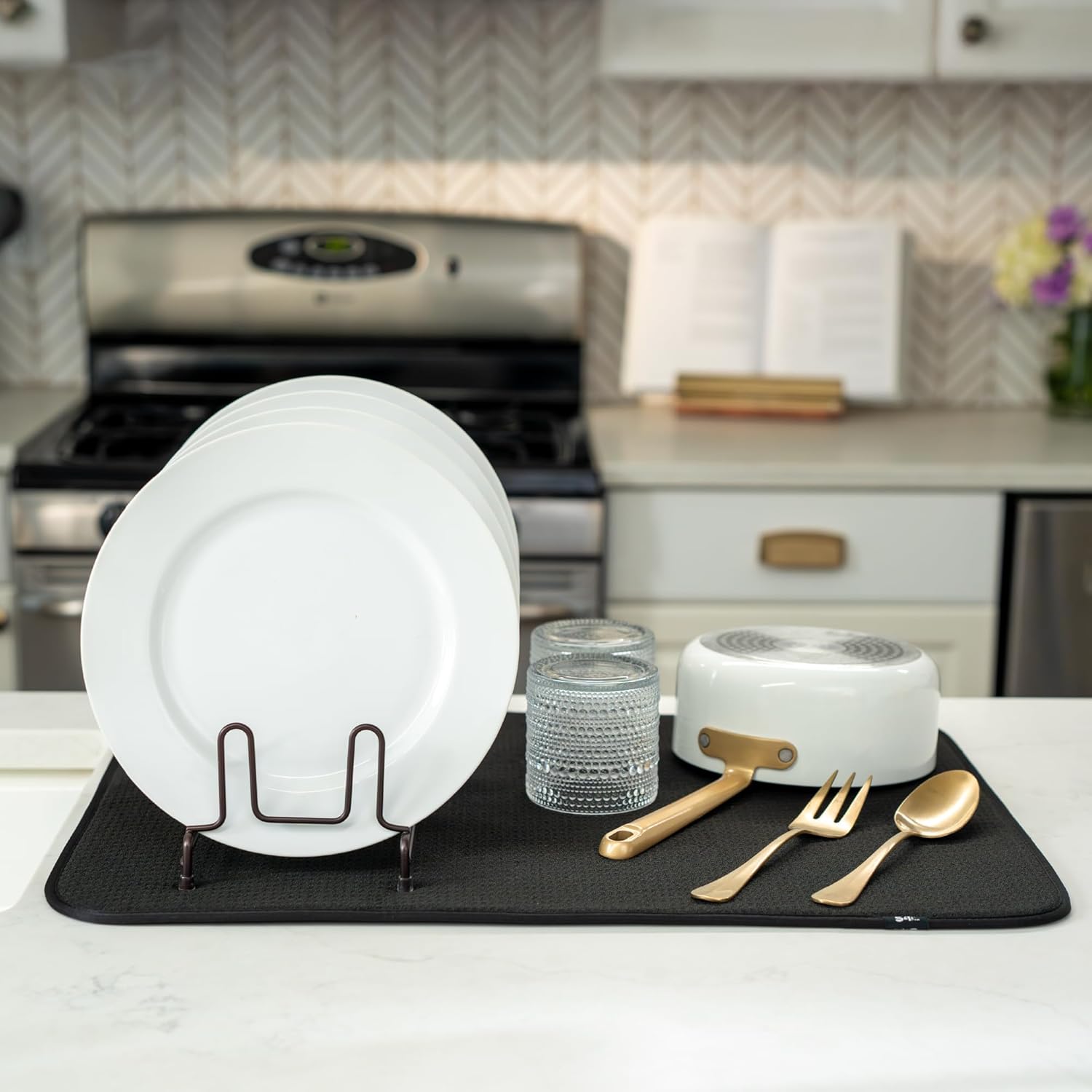 Dish drying mats for kitchen counter are reusable, machine washable, and easy to store for kitchen organization; durable construction will not chip or break like a stone dish drying mat for kitchen