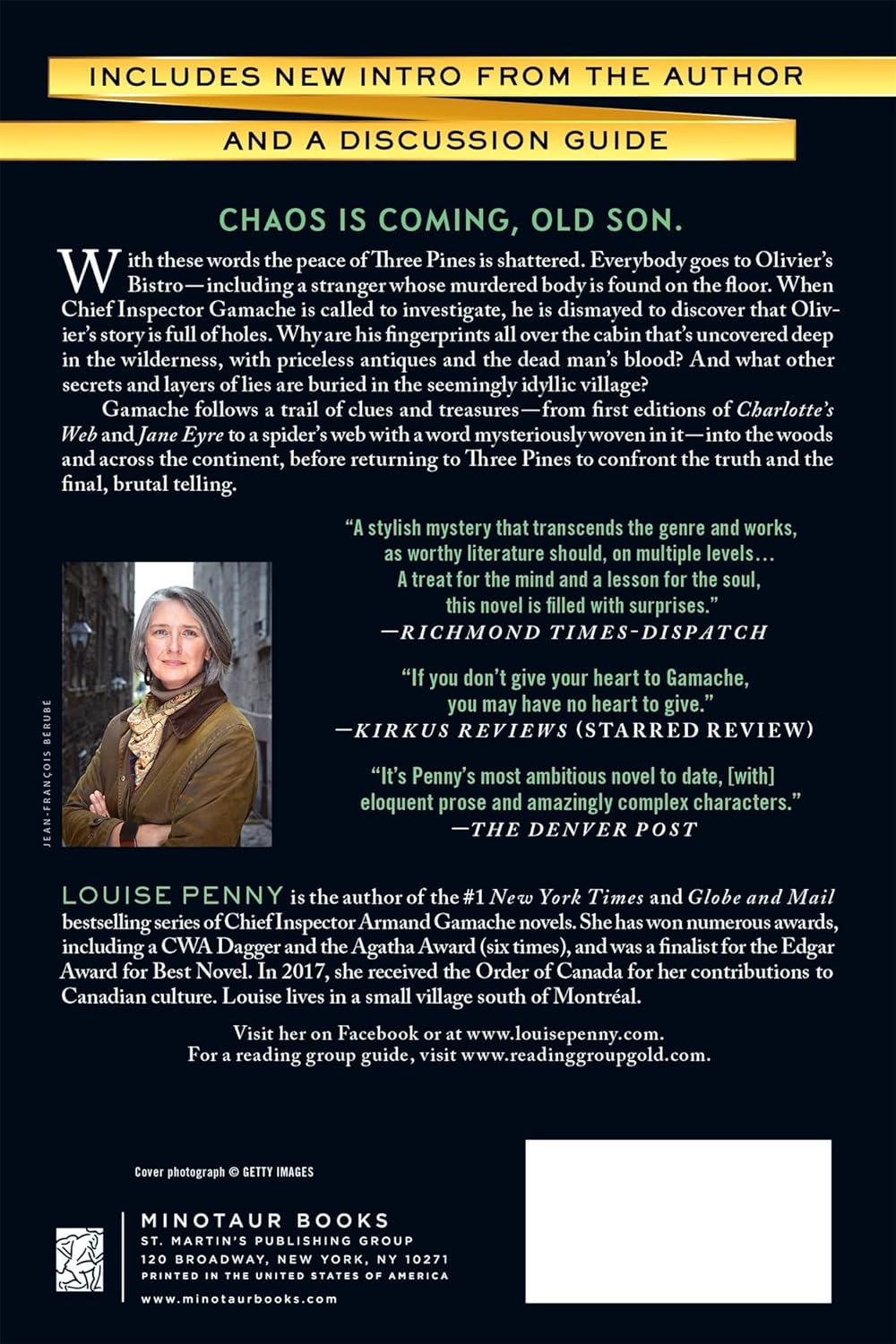 Gamache follows a trail of clues and treasures―from first editions of Charlotte’s Web and Jane Eyre to a spiderweb with a word mysteriously woven in it―into the woods and across the continent, before returning to Three Pines to confront the truth and the final, brutal telling.
